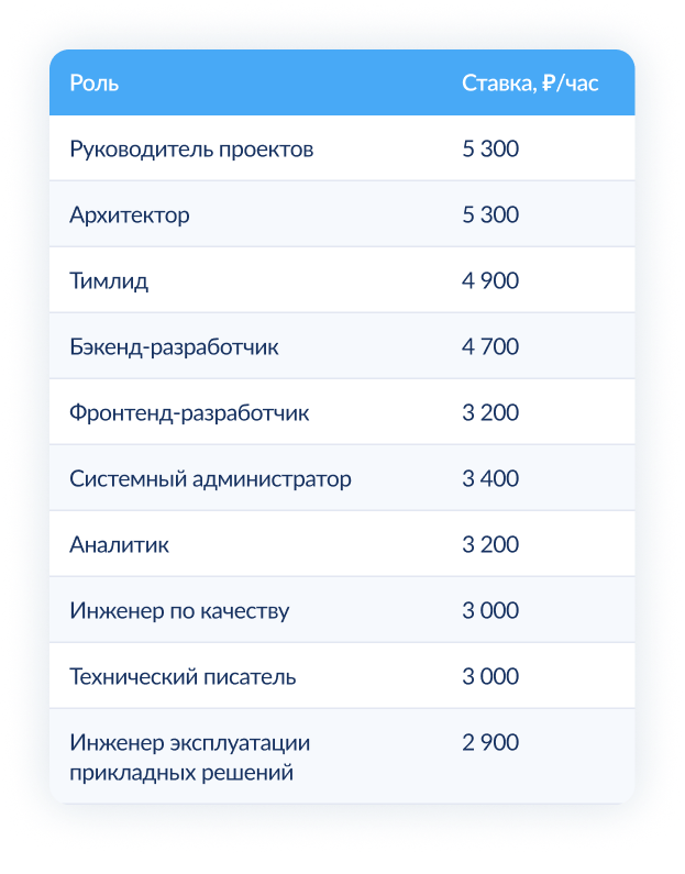 Работы выполняются по почасовым ставкам в зависимости от роли специалиста. Возможны пакеты часов и SLA‑сопровождение.